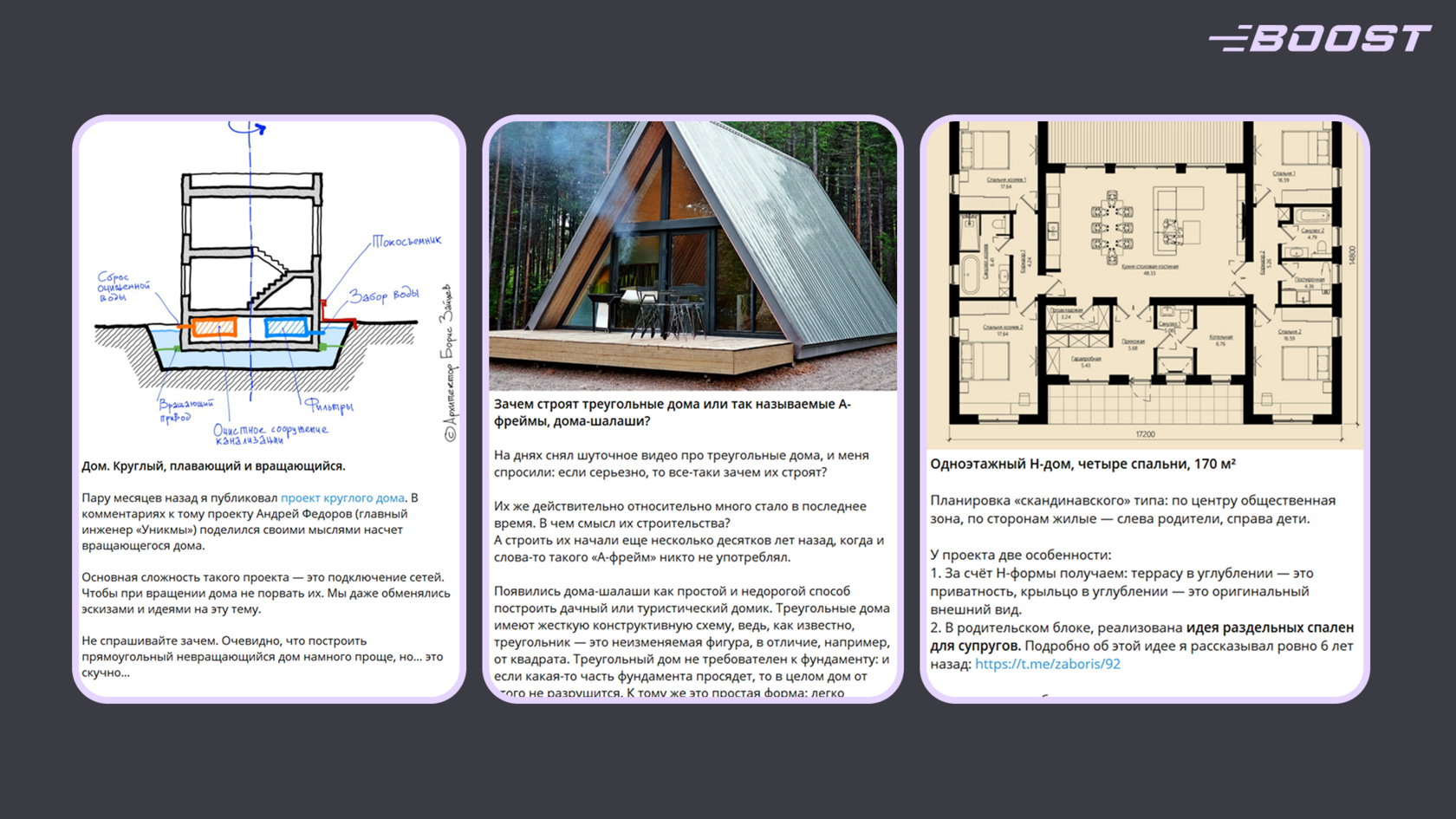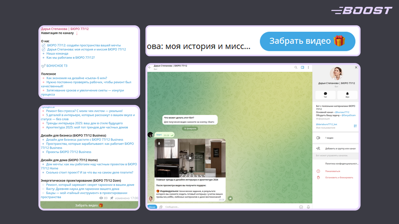 Во-вторых, в телеграме можно комплексно подать все ключевые смыслы: использовать различные форматы контента (подборки реализованных объектов по типам и стилям, кейсы с описанием задач и решений, видео с процессом проектирования и объяснением логики объемно-пространственных решений, чек-листы для подготовки к строительству, подборки материалов, поставщиков и технологий, короткие заметки о свете, эргономике и работе с подрядчиками), а также задействовать чат-ботов для автоматизации первичного сбора информации, записи на консультацию, отправки брифов и ответов на базовые вопросы о стоимости и этапах работы.