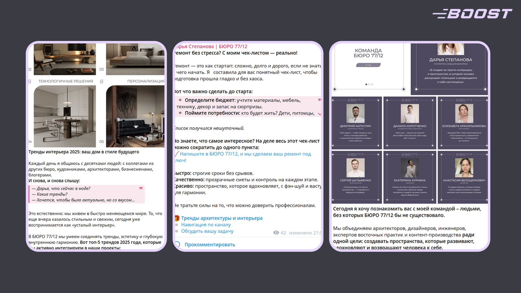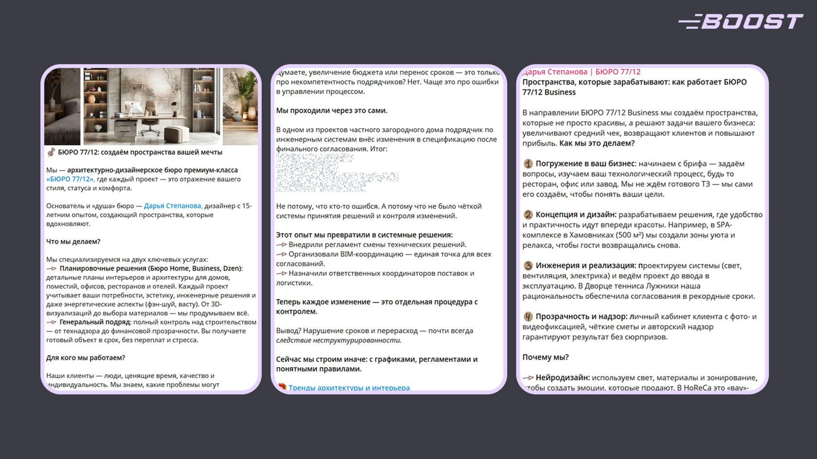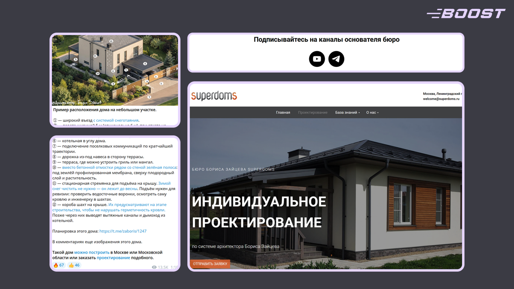 И, конечно, канал работает как ваша постоянная и, что важно, абсолютно бесплатная витрина вашего портфолио и экспертизы. Когда потенциальный заказчик сомневается в выборе архитектора, он может зайти в ваш канал, увидеть реальные примеры реализованных объектов, отзывы клиентов с фото результатов, ваши мысли об архитектуре и профессиональный подход к решению пространственных задач. Это формирует доверие и показывает, что вы — специалист, который действительно помогает людям создавать среду, в которой хочется жить, работать и находиться.