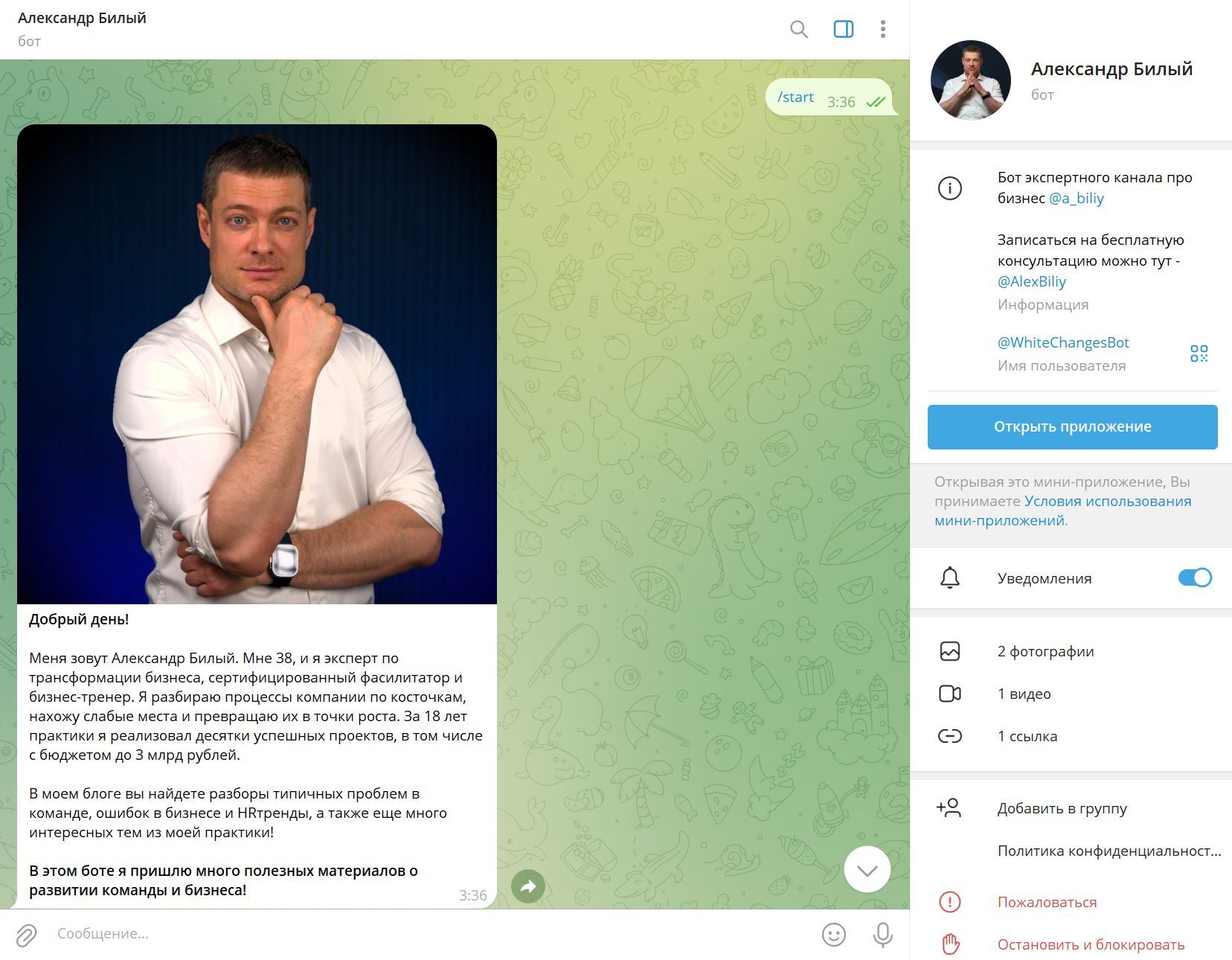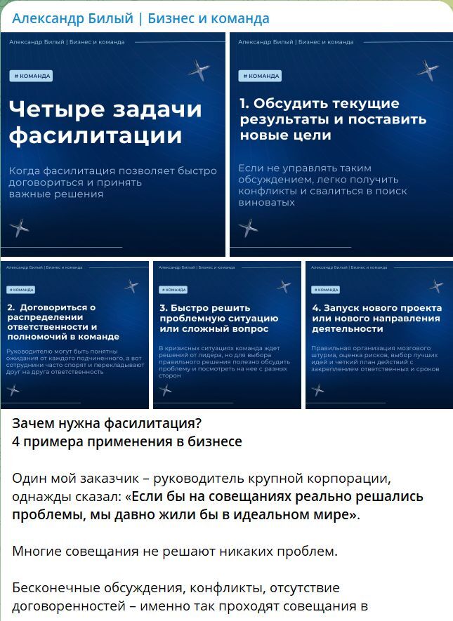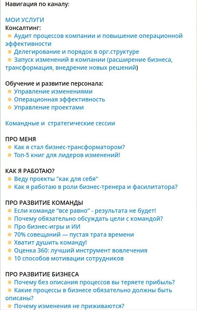 широкий спектр услуг (стратегические сессии, тренинги, постановка финансового учета), но для эффективных продаж в Telegram важно было выбрать