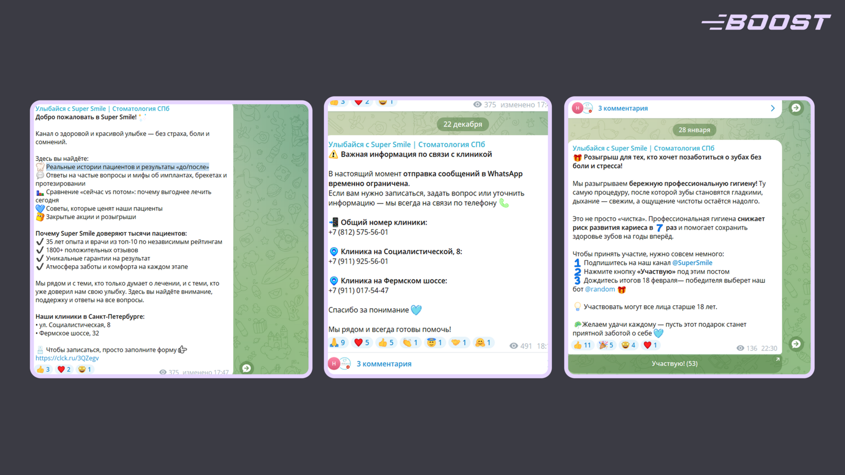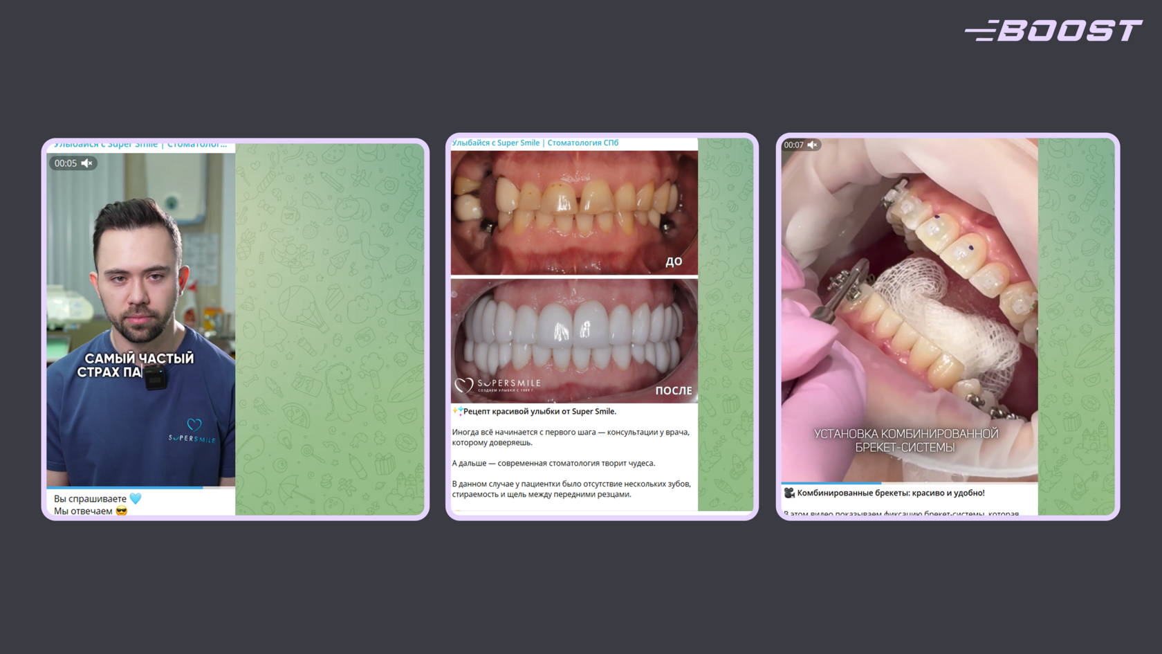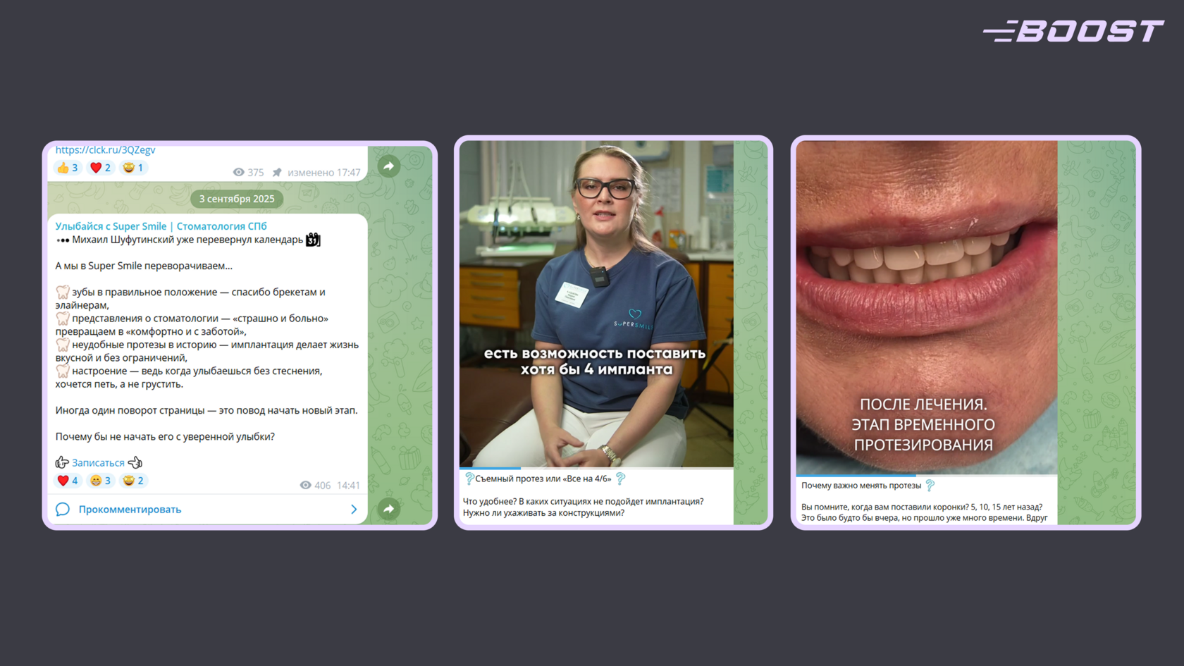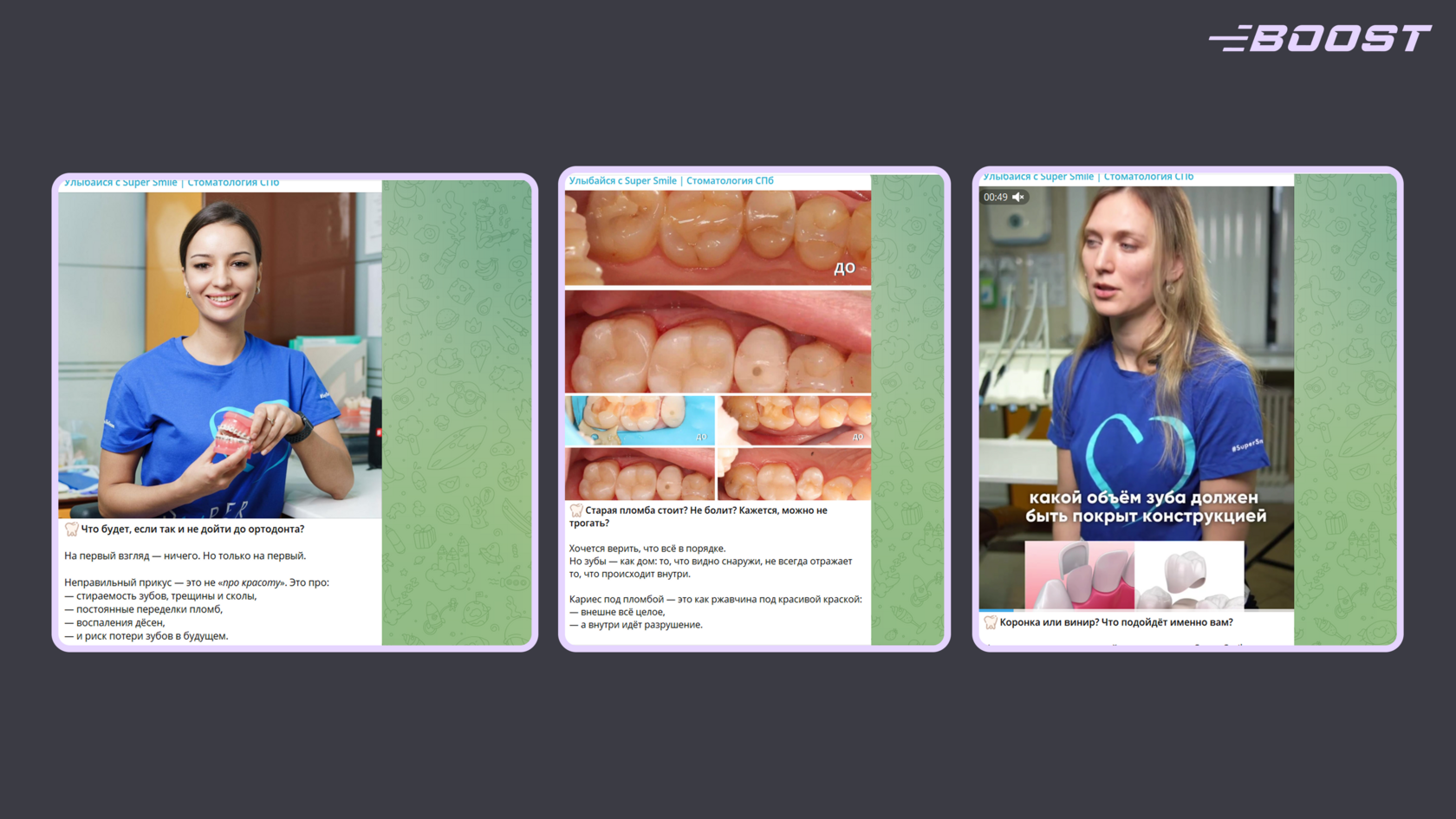- Подборки советов и разборы мифов: например, «5 главных мифов об отбеливании зубов» или «Импланты — это навсегда? 3 факта, которые нужно знать».