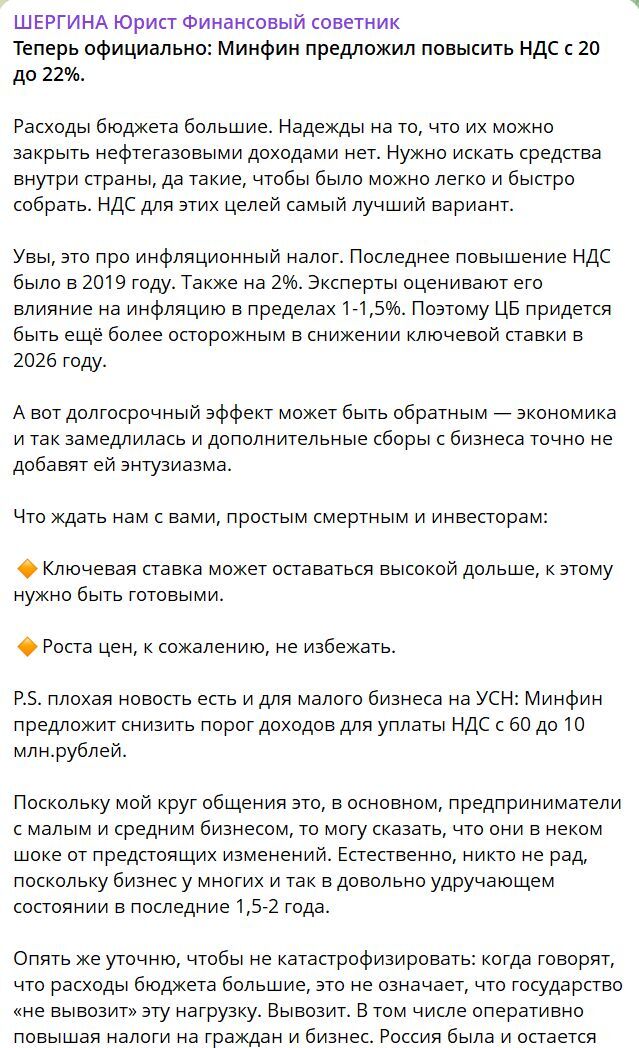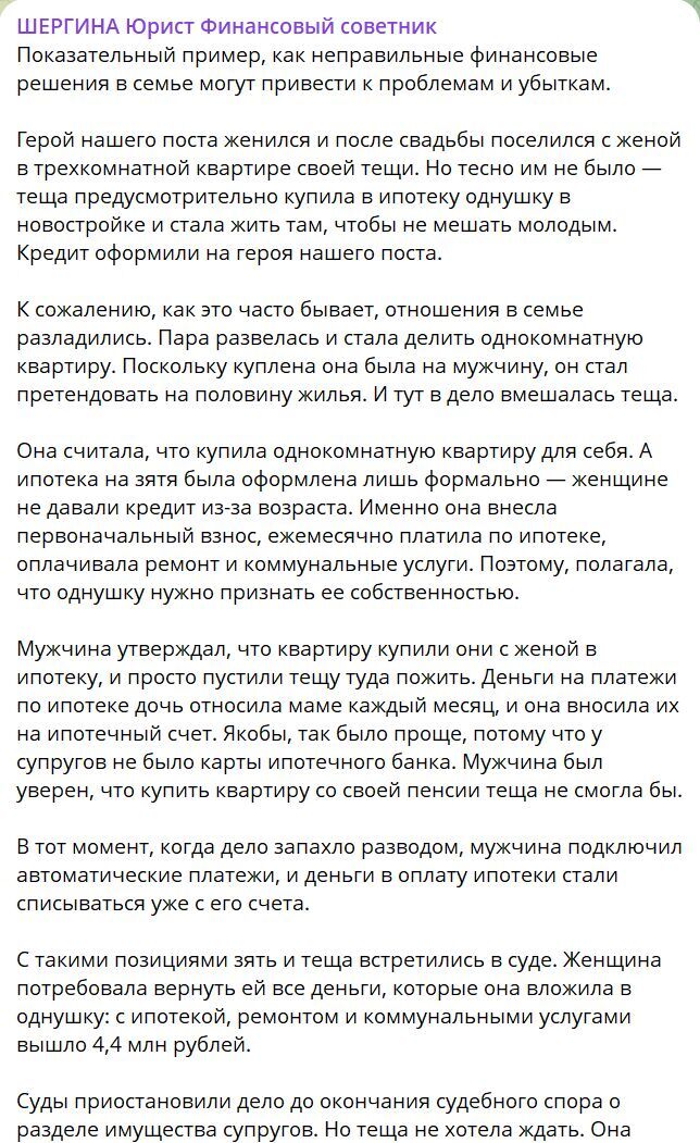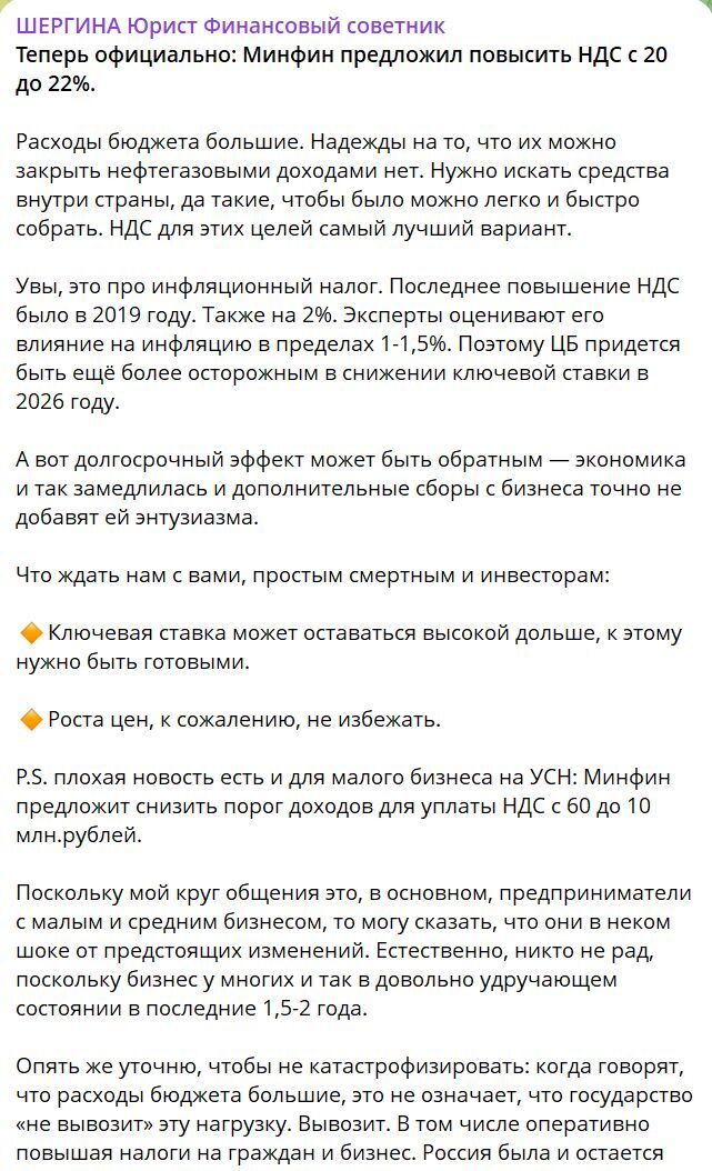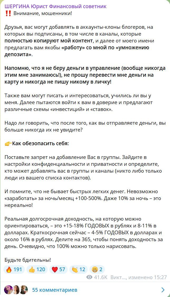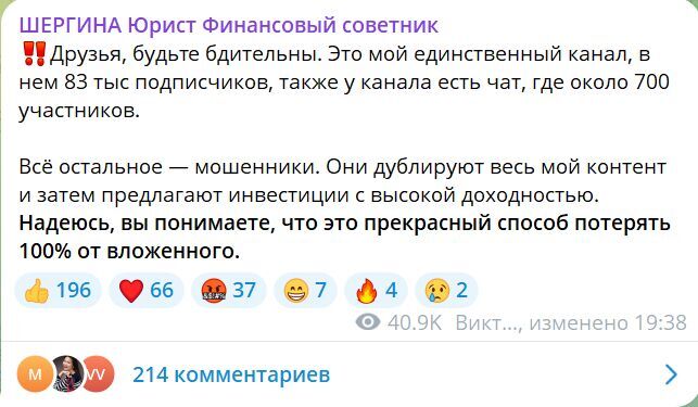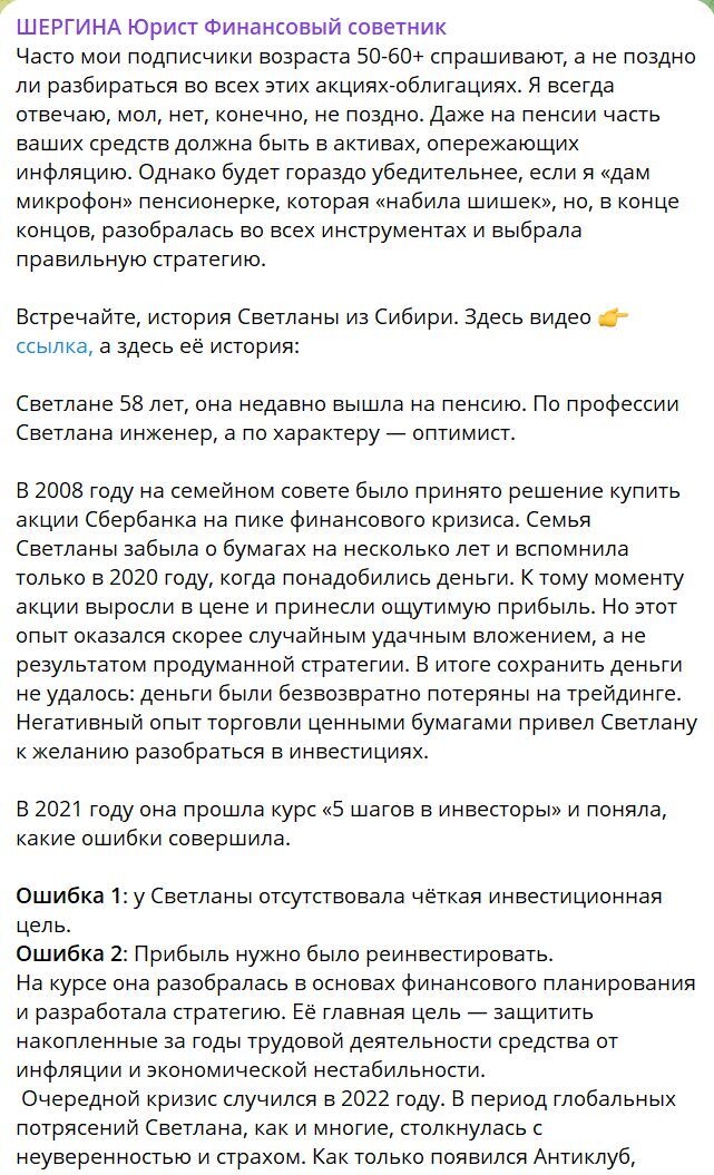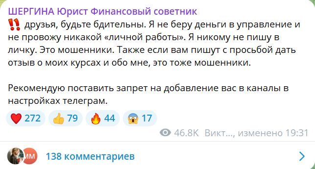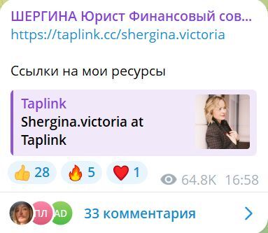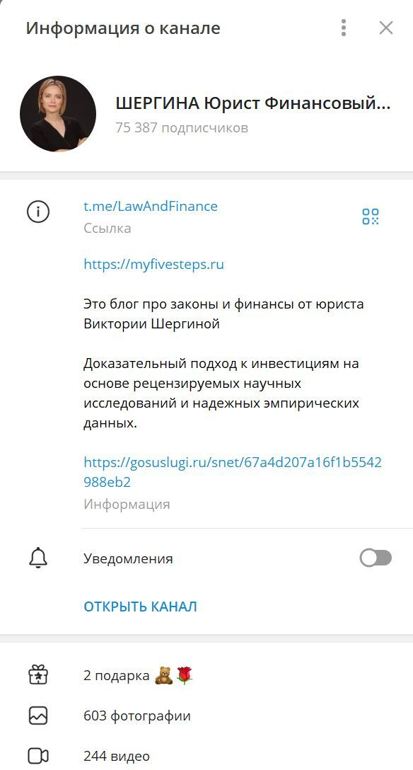 Телеграм-канал «Шергина Юрист Финансовый советник» посвящен юридическим и финансовым консультациям: здесь разбираются изменения в законодательстве, вопросы инвестиций, налогообложения и защиты прав граждан; количество подписчиков — 75 390.