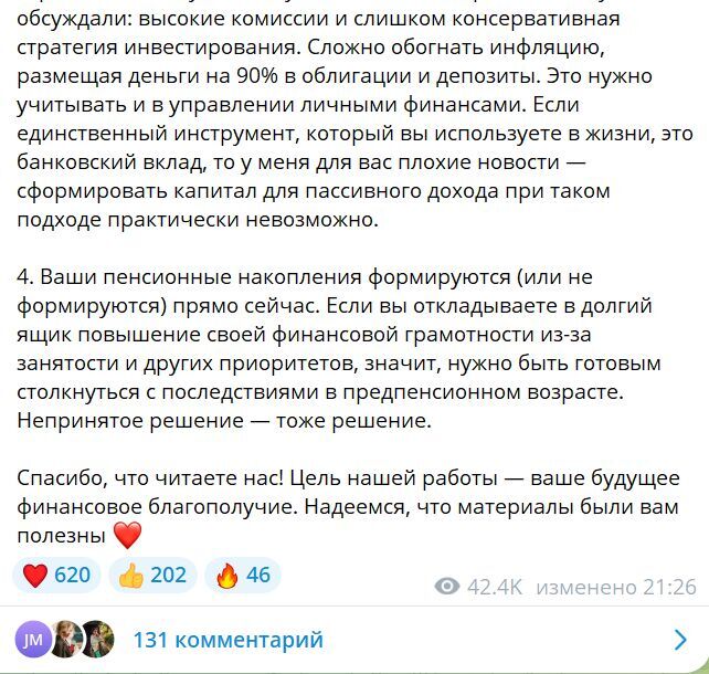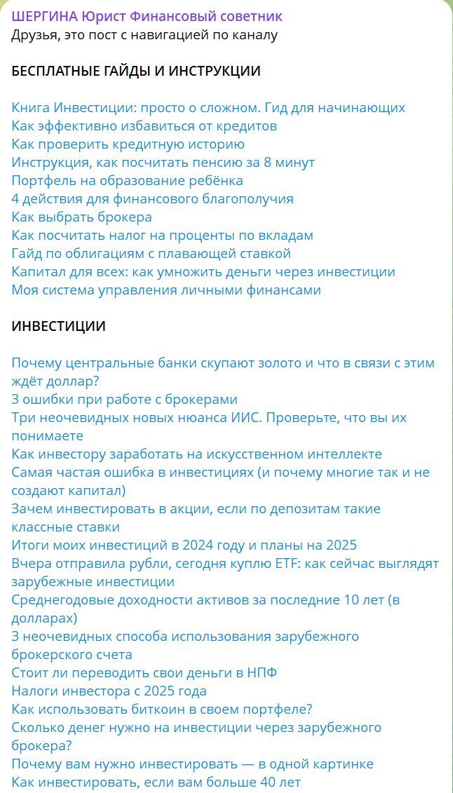 Отметим, что для любого телеграм-канала важен пост-навигация, в котором находятся 15−20 важных постов, отражающих эксперта / компанию. В канале Виктории