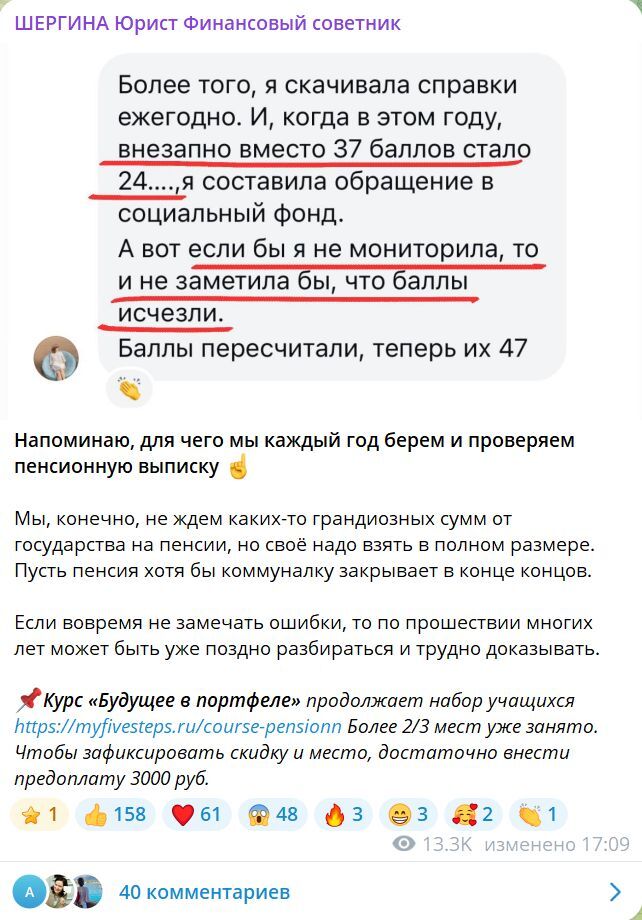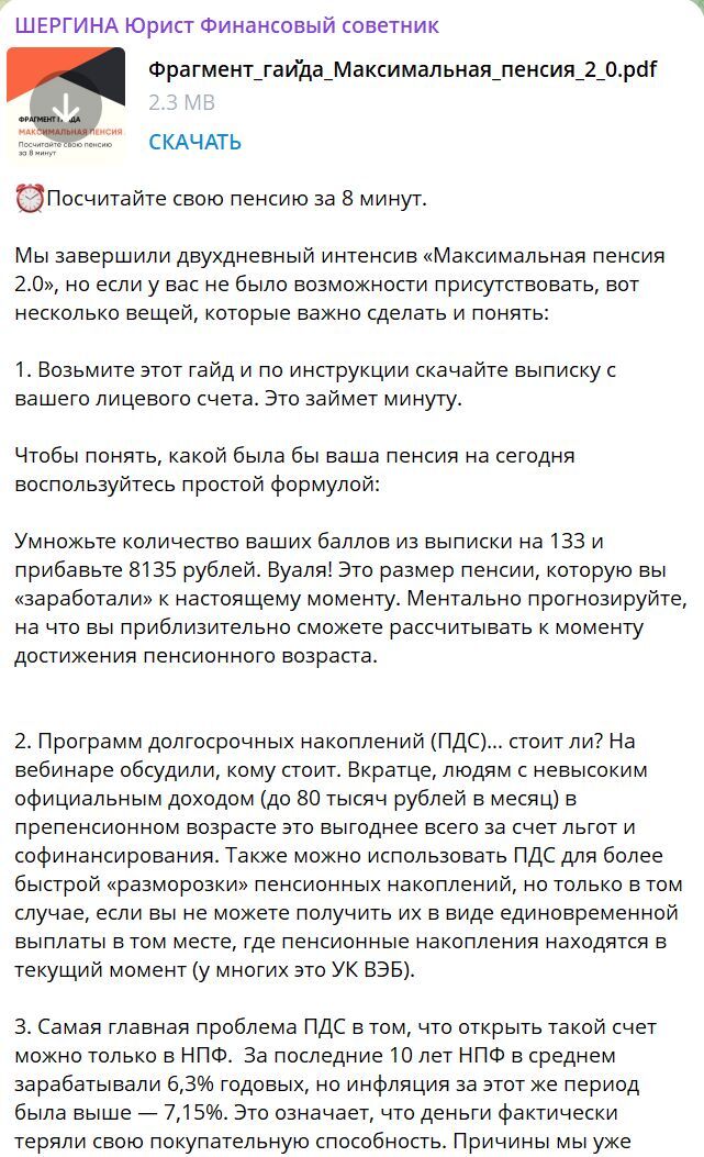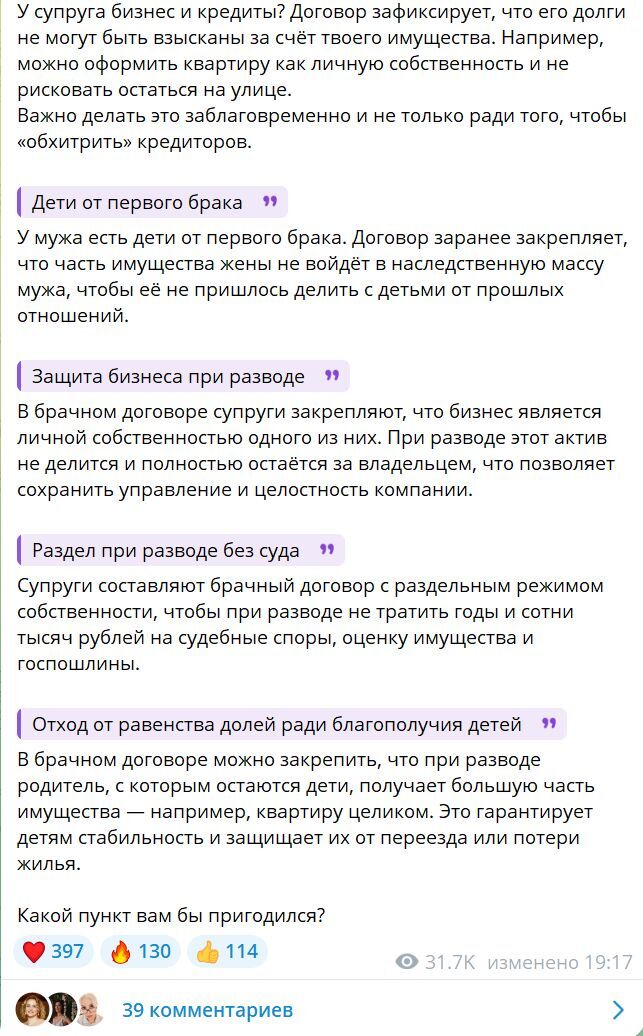 Такой формат позволяет и повышать общую юридическую грамотность широкой аудитории, и мотивировать подписчиков обращаться за углубленной помощью в формате платных вебинаров, курсов и индивидуальных консультаций.