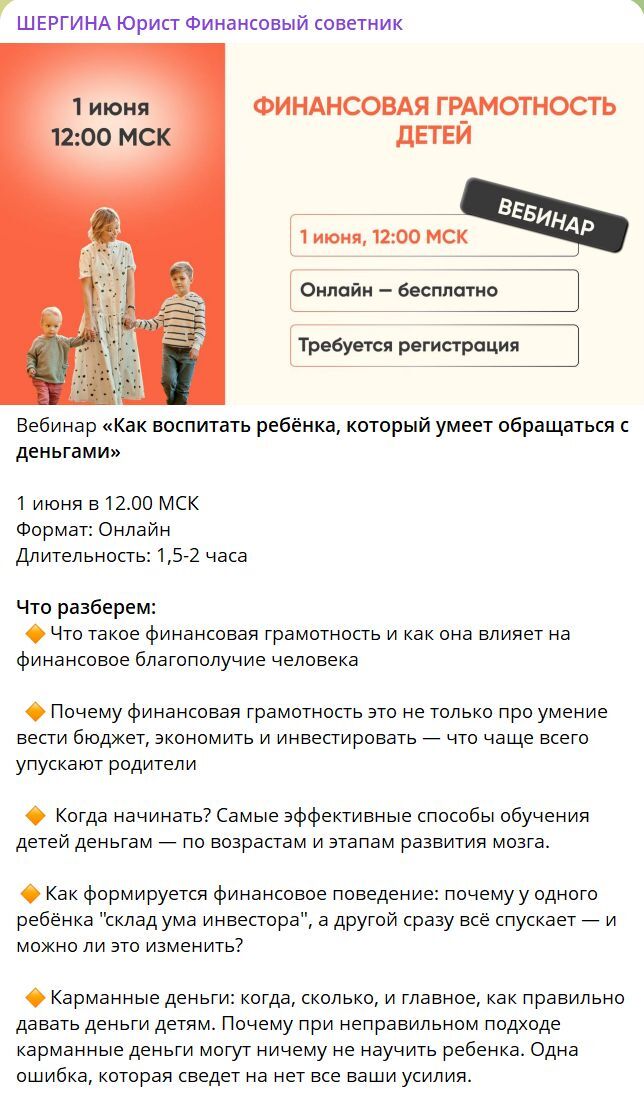 - Пост-анонс о предстоящем вебинаре по финансовой грамотности детей,