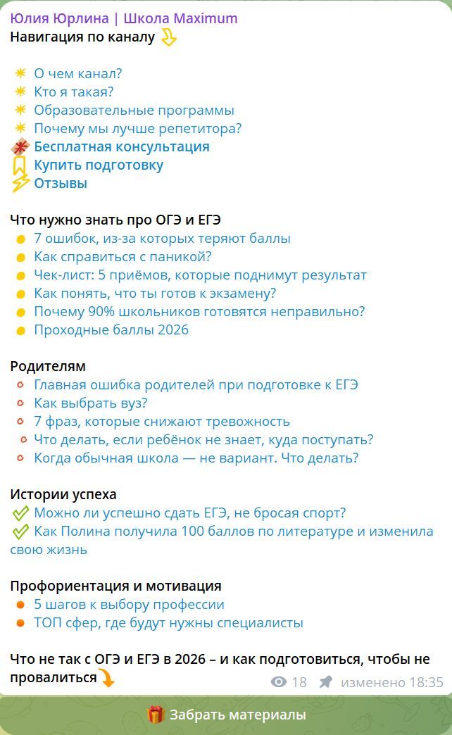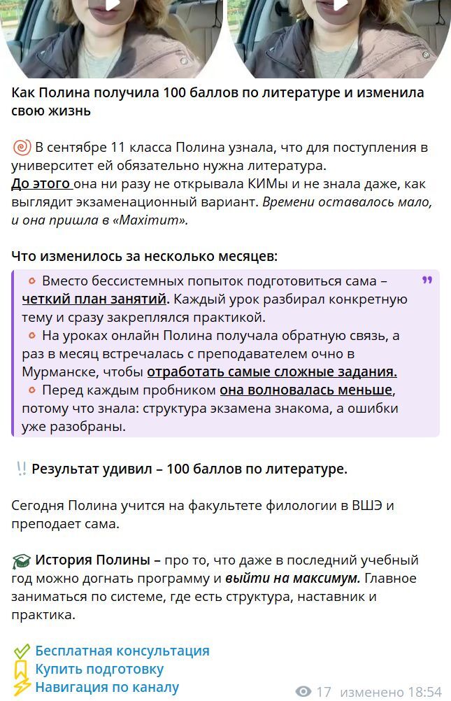 Цель — попасть в триггерные точки ЦА, но сделать это максимально грамотно: для школьников канал должен быть другом и наставником, а для родителей — экспертом и помощником. Важно, чтобы родители воспринимали данный контент мягко, и в этом каналу помогают эксперты и грамотно поданный контент (юмор, 0 занудности, стратегия и экспертность).