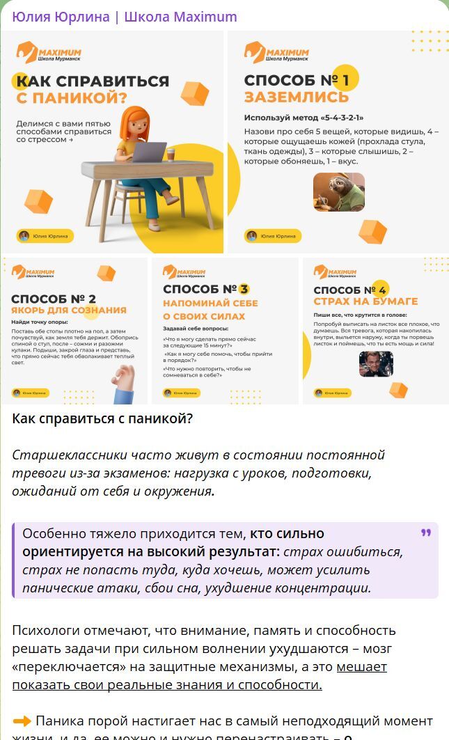 Отметим, что мы разработали единую дизайн-концепцию для канала с яркими цветами и удобочитаемым текстом: карточки позволяют сократить текст в постах, а единая дизайн-задумка объединяет контент и делает его визуально привлекательным как для учеников, так и для родителей.