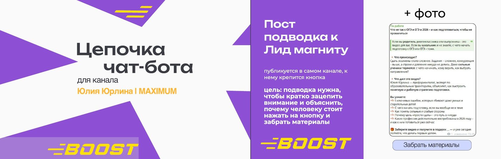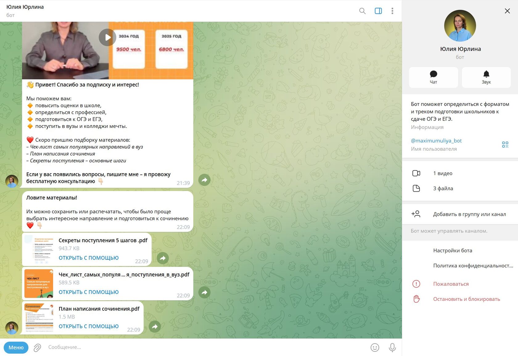 - Создан чат-бот для автоматической выдачи видео о подготовке к экзаменам и запуска цепочки автопрогрева.