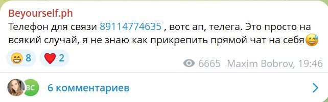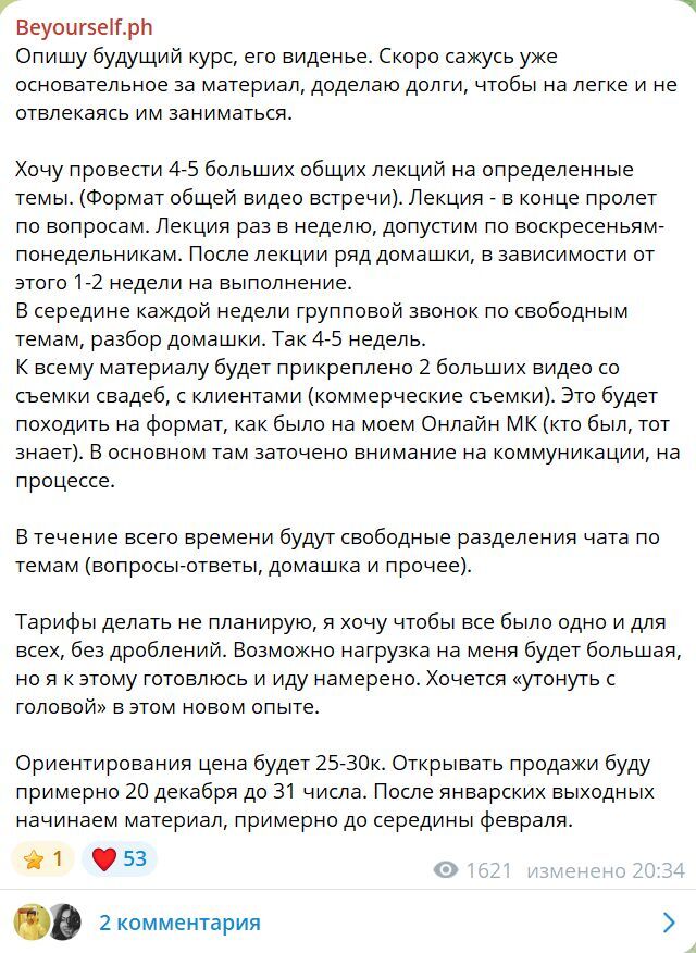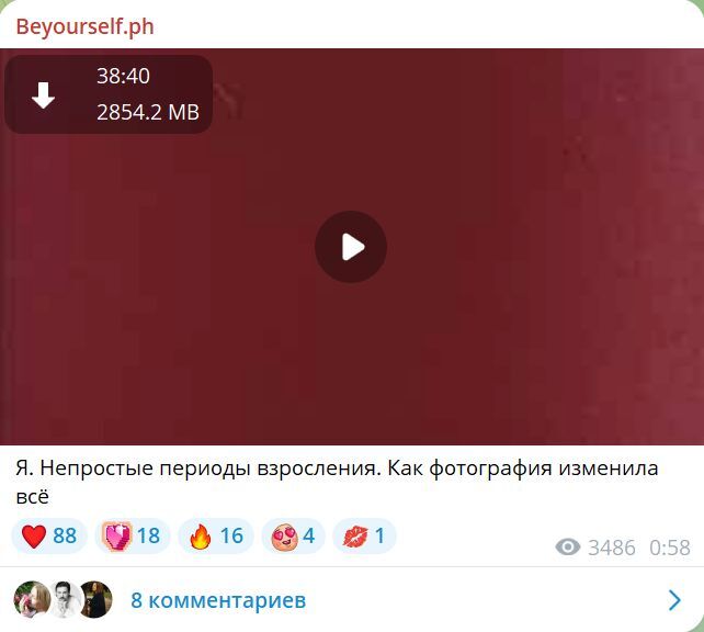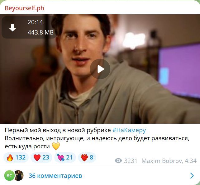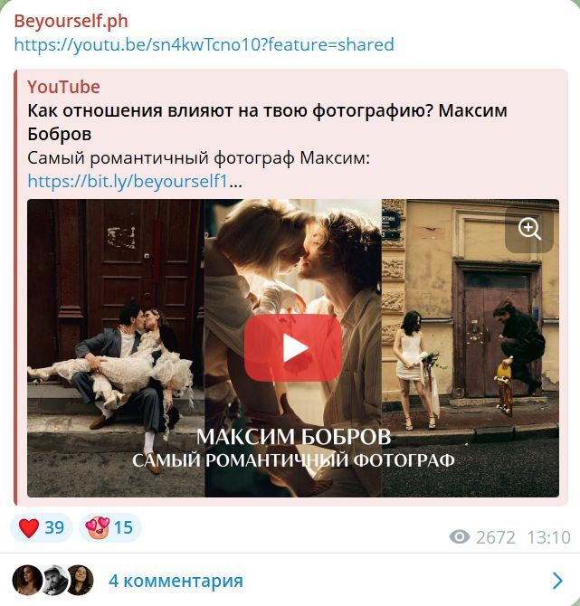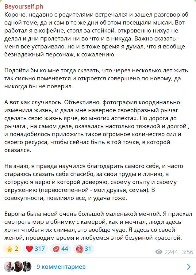 Телеграм-канал «Beyourself.ph» — личный блог фотографа Максима Боброва, который работает в жанрах портретной, свадебной и лайфстайл-фотографии. Канал совмещает демонстрацию визуальных работ, искренние личные тексты и элементы профессионального дневника. Контент подается в живом, эмоциональном и доверительном тоне, что создает ощущение близкого общения с автором.