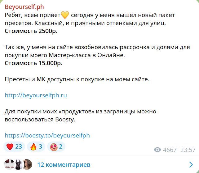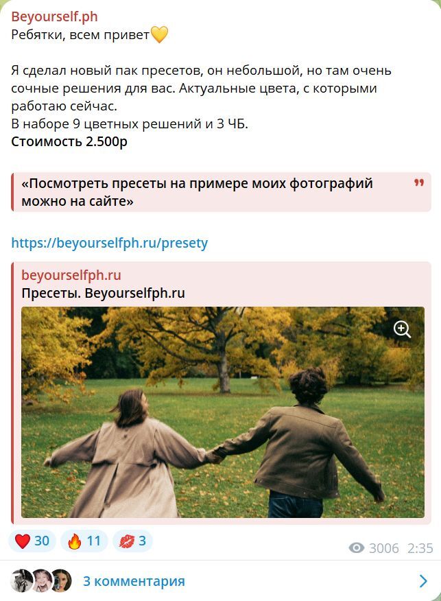 - Пост-анонс продажи нового пакета пресетов со ссылкой на сайт, где можно приобрести продукт и ознакомиться с работами автора.