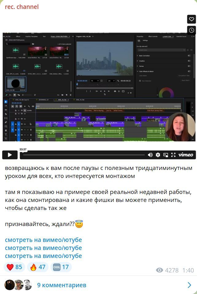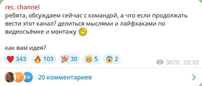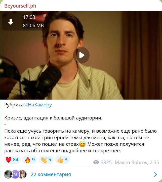 - Пост с идентичной рубрикой, где автор канала рассказывает о кризисе и привыкании к большой аудитории. Пост в формате видеоролика.