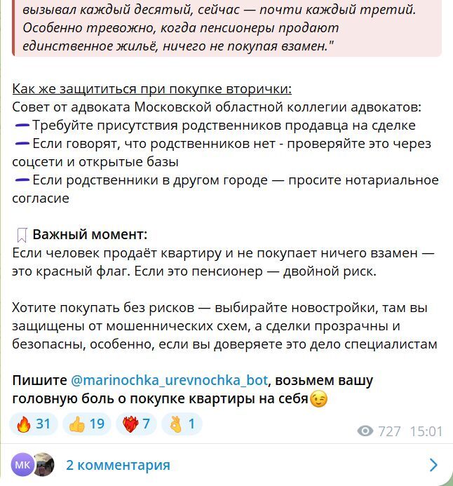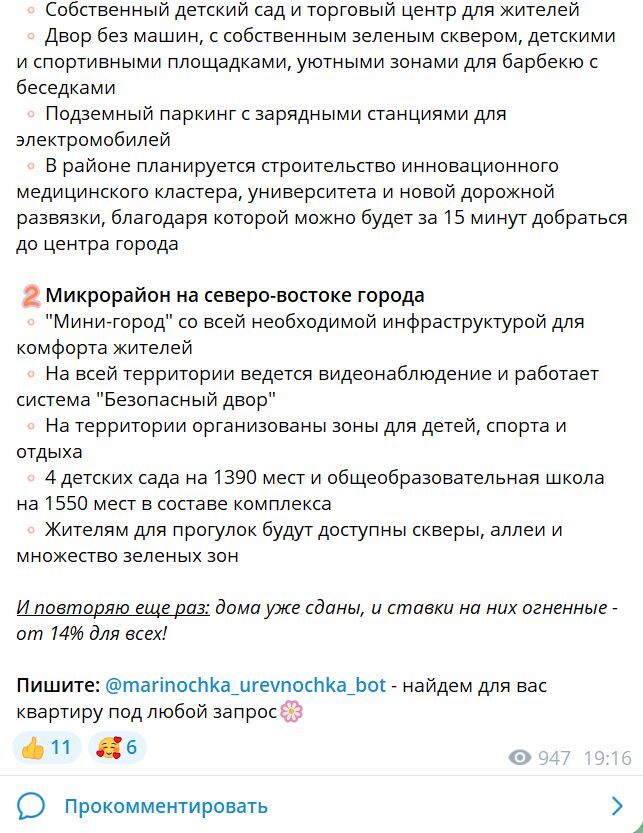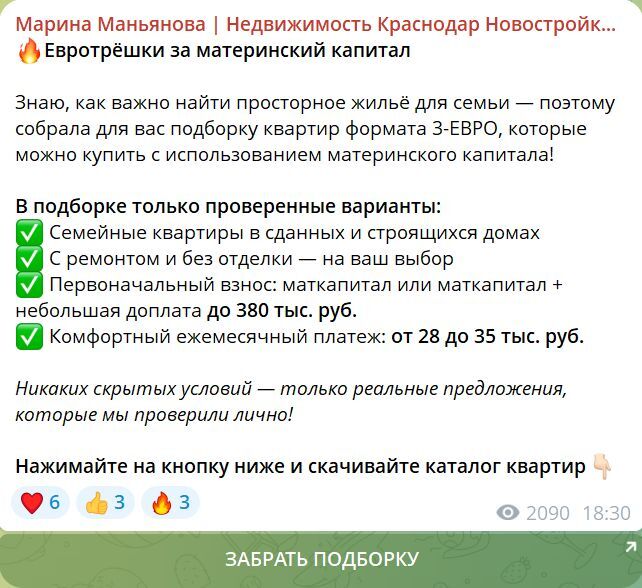- Пост-анонс трехкомнатных квартир за материнский капитал, которые находятся в каталоге. Его можно забрать в боте Марины.