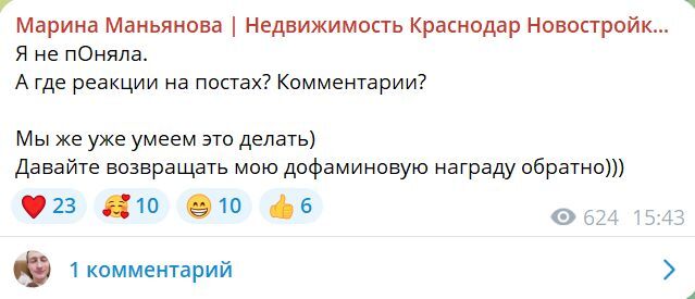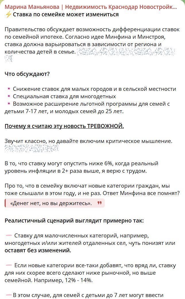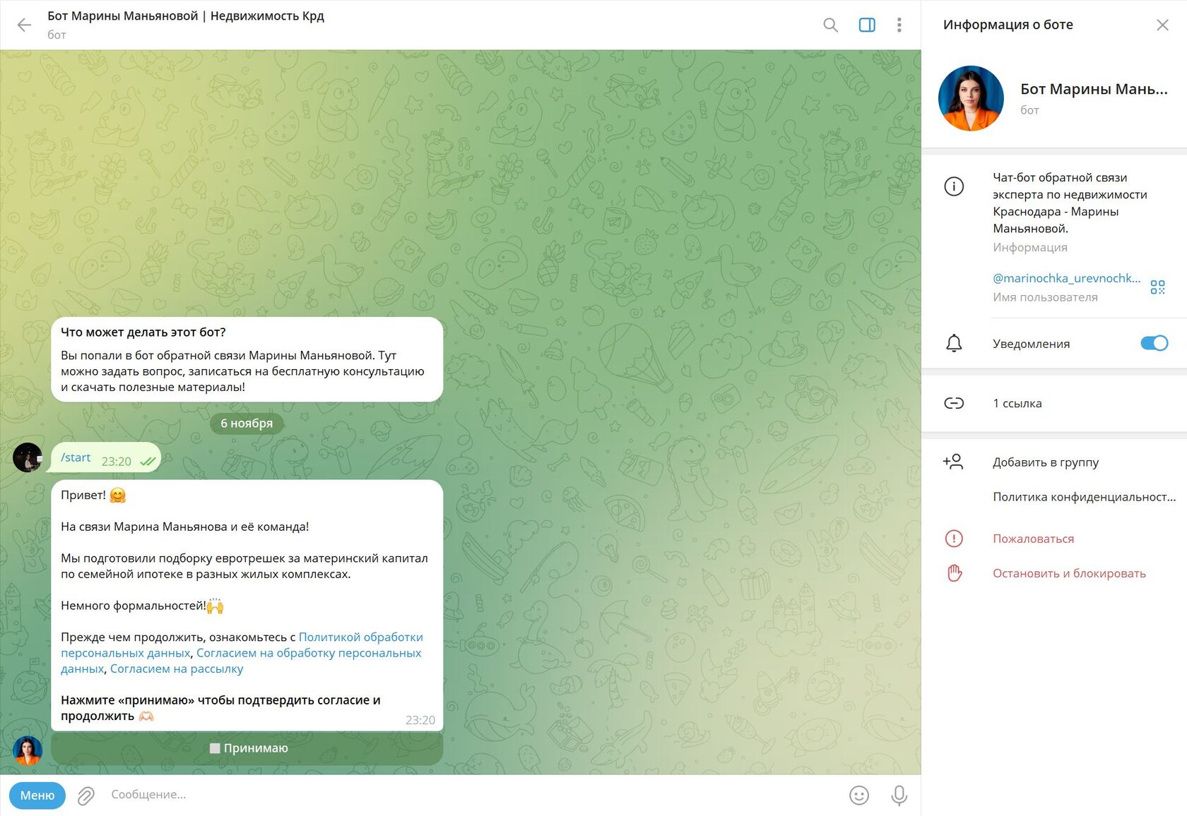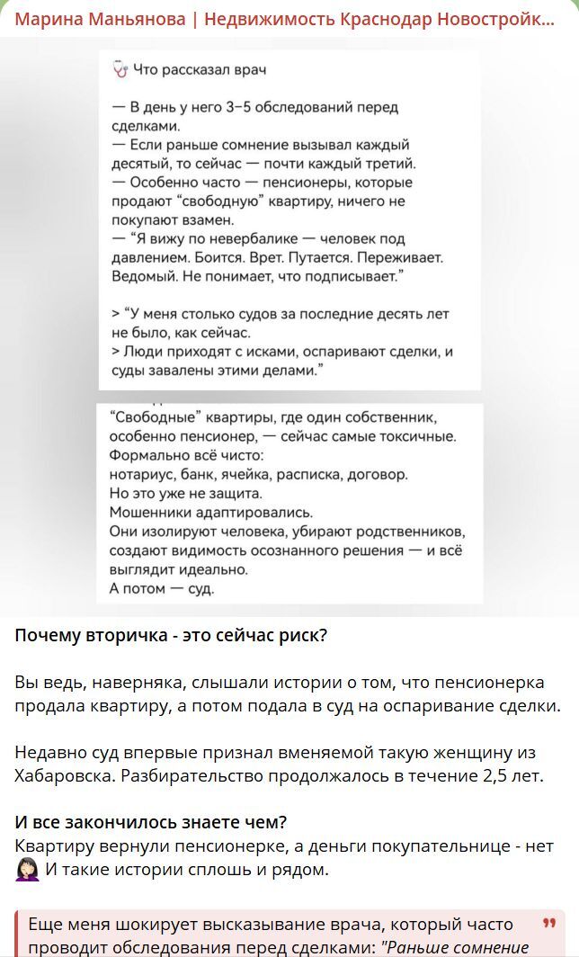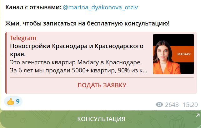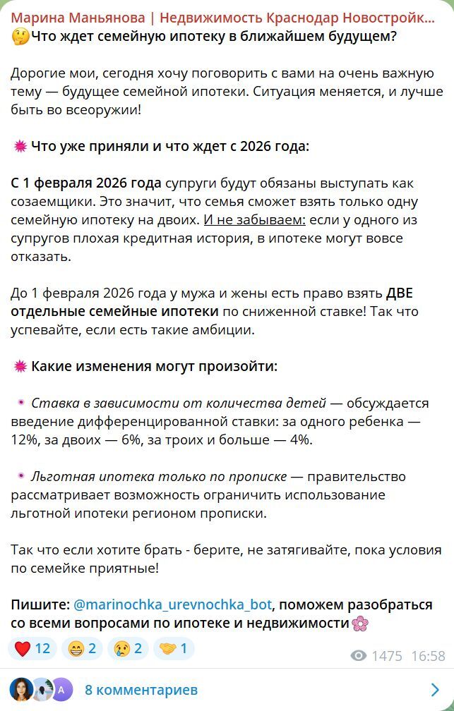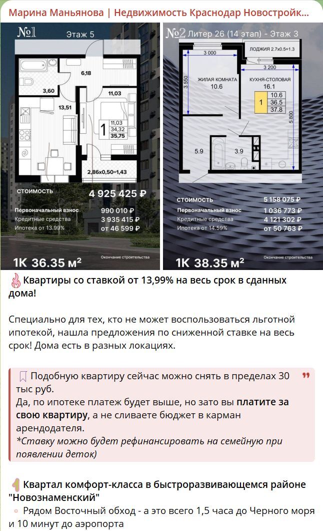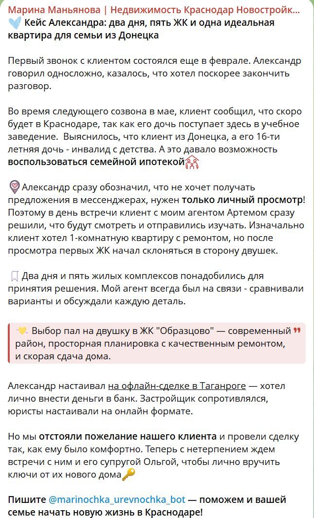 Телеграм-канал «Марина Маньянова | Недвижимость Краснодар Новостройки Квартиры» посвящен продаже квартир и привлечению клиентов через демонстрацию выгодных предложений, экспертные разборы рынка и общение с аудиторией. Тон коммуникации дружелюбный, что помогает сформировать доверие и ощущение «своего человека» в сфере недвижимости.