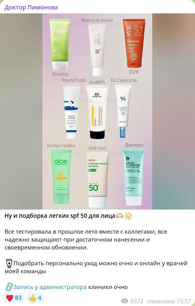- Прямой CTA: запись через WhatsApp-номер администратора, ссылка встроена в пост (например, подборка SPF или кремов).