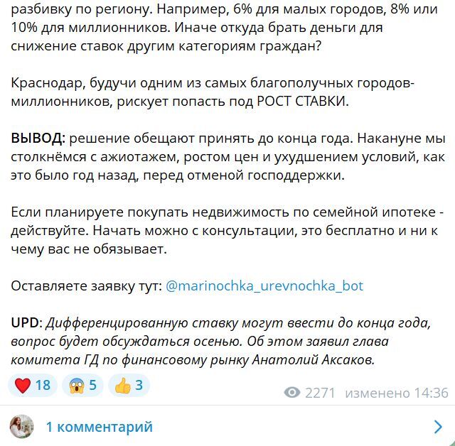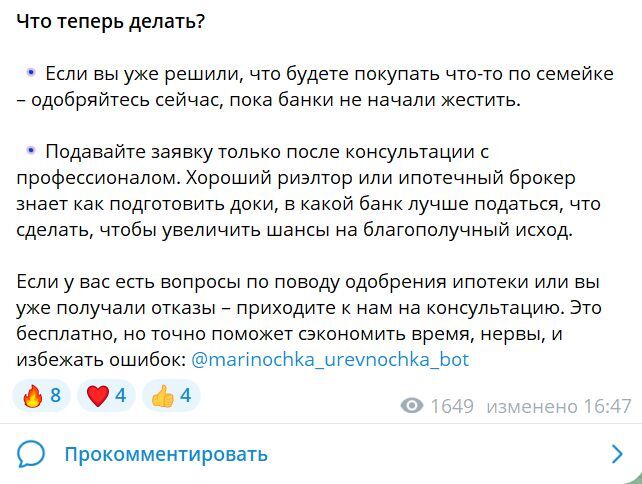 Основная задача заключается в том, чтобы продвигать конкретные объекты и ипотечные программы, а также создать экспертный имидж. Контент строится на сочетании образовательных материалов, аналитики и продающих публикаций с четкими призывами к действию: подписка, заявка через бота, переход на консультацию.