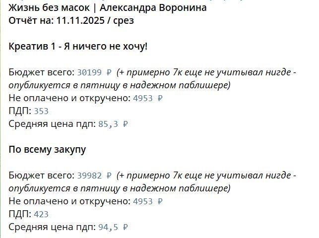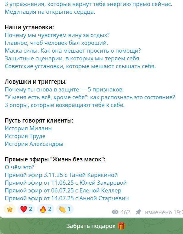 В канал Александры пришло целых 400 подписчиков и появились новые клиенты, а также вовлеченная аудитория. Благодаря совместной работе над каналом мы смогли упаковать все важные смыслы, и, таким образом, telegram-канал стал главной точкой сбора как текущих покупателей продуктов заказчика, так и потенциальных. Именно в Telegram-канале далее мы собираем аудиторию из всех социальных сетей клиента.